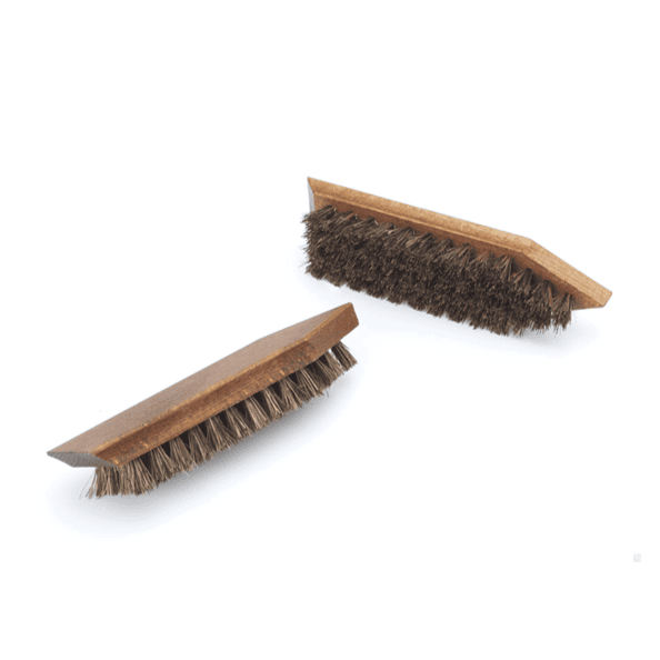 #26340 "Exklusive Schmutzbürste aus Holz", 185 x 47 x 14 mm, Holzkörper mit Spitze und Schräge, mit Abrundungen und Hohlkehlen, braun lackiert, mit Kokosfasern natur, VE 10 Stück im Beutel, 15 x 10 Stück im Umkarton.
