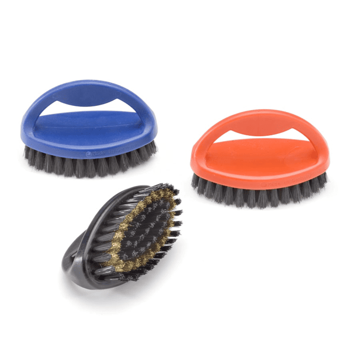 #91557 "Raulederbürste mit Griff Design", 100 x 50 x 48 mm, Kunststoffkörper farblich sortiert, synthetische Borste schwarz mit Messingdrahtkranz, VE 12 Stück im Beutel, 26 x 12 Stück im Umkarton.