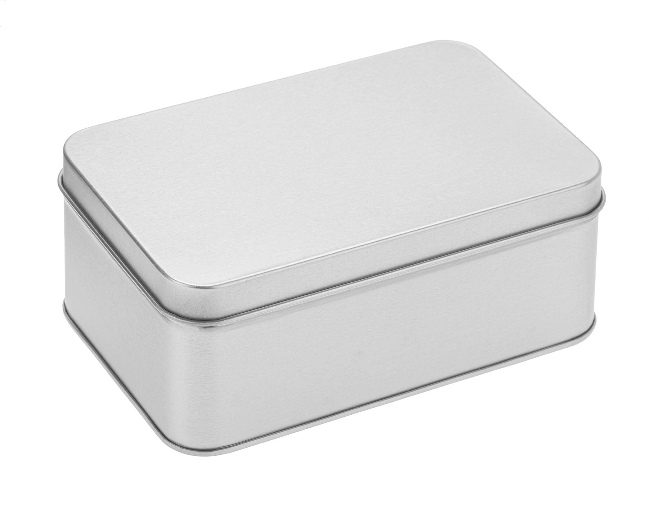 Form:      rechteckige Blechdose mit Stülpdeckel, Alu-Optik, matt